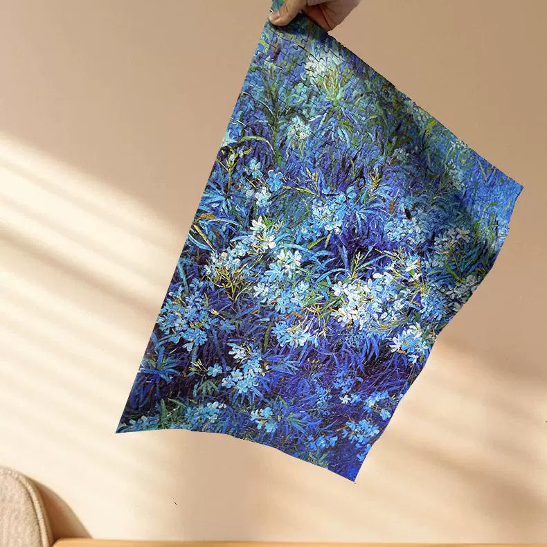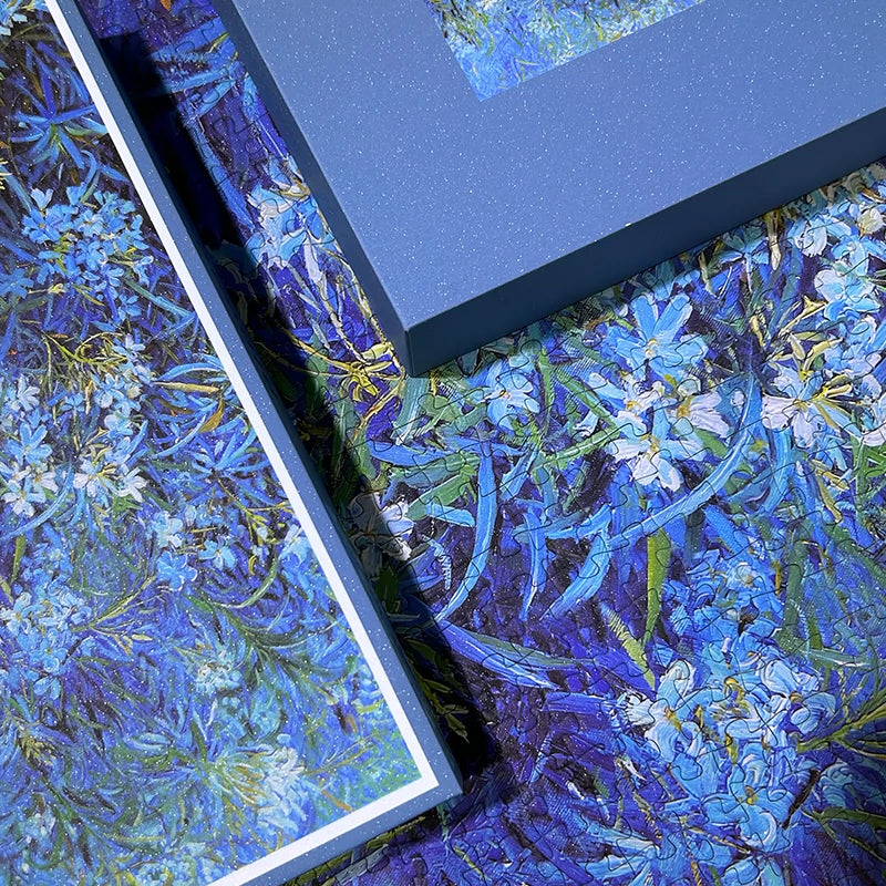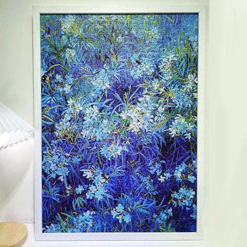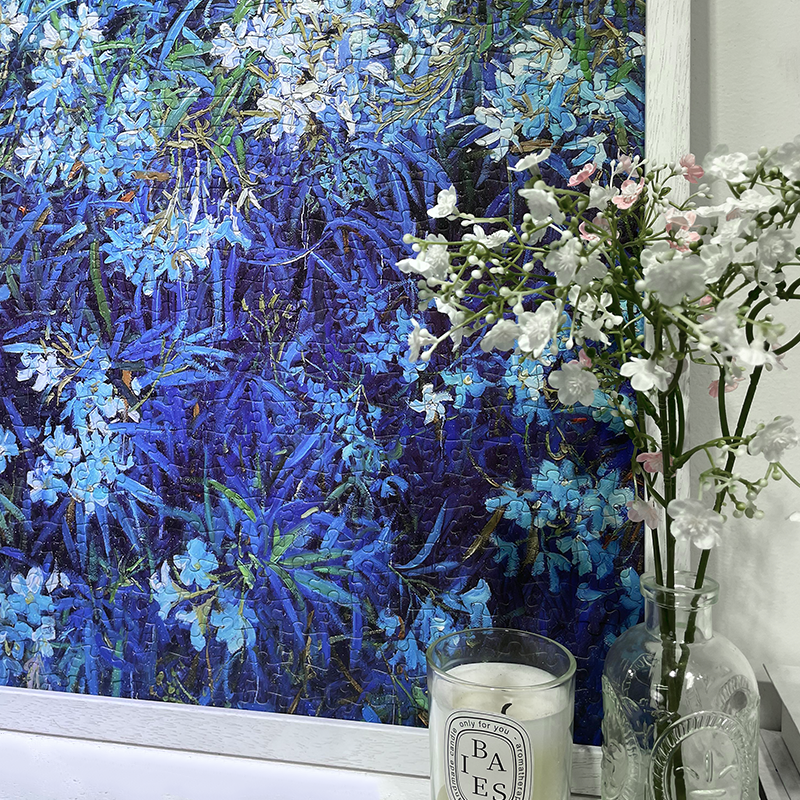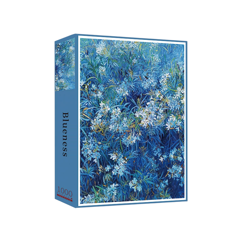 "Blueness" invites you into a tranquil world of lush blue foliage and delicate white blossoms. Inspired by impressionist brushstrokes, this 1000-piece puzzle captures the beauty of nature in a dreamy, painterly style. The intricate interplay of deep blues and soft whites offers a soothing yet rewarding challenge for puzzle enthusiasts and art lovers alike. Complete it to reveal a breathtaking masterpiece that radiates serenity.