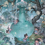 In a world gently cradled by mist and blossom, little spirits play among lotus leaves, shimmering waters, and rocky streams. A delicate porcelain vase overflows with a magical trickle of water, as a white bunny perched on a lotus leaf pours from above. Surrounded by blooming plum trees and soft mountain silhouettes, the scene hums with quiet joy and the playful serenity of a drizzle-woven shore.