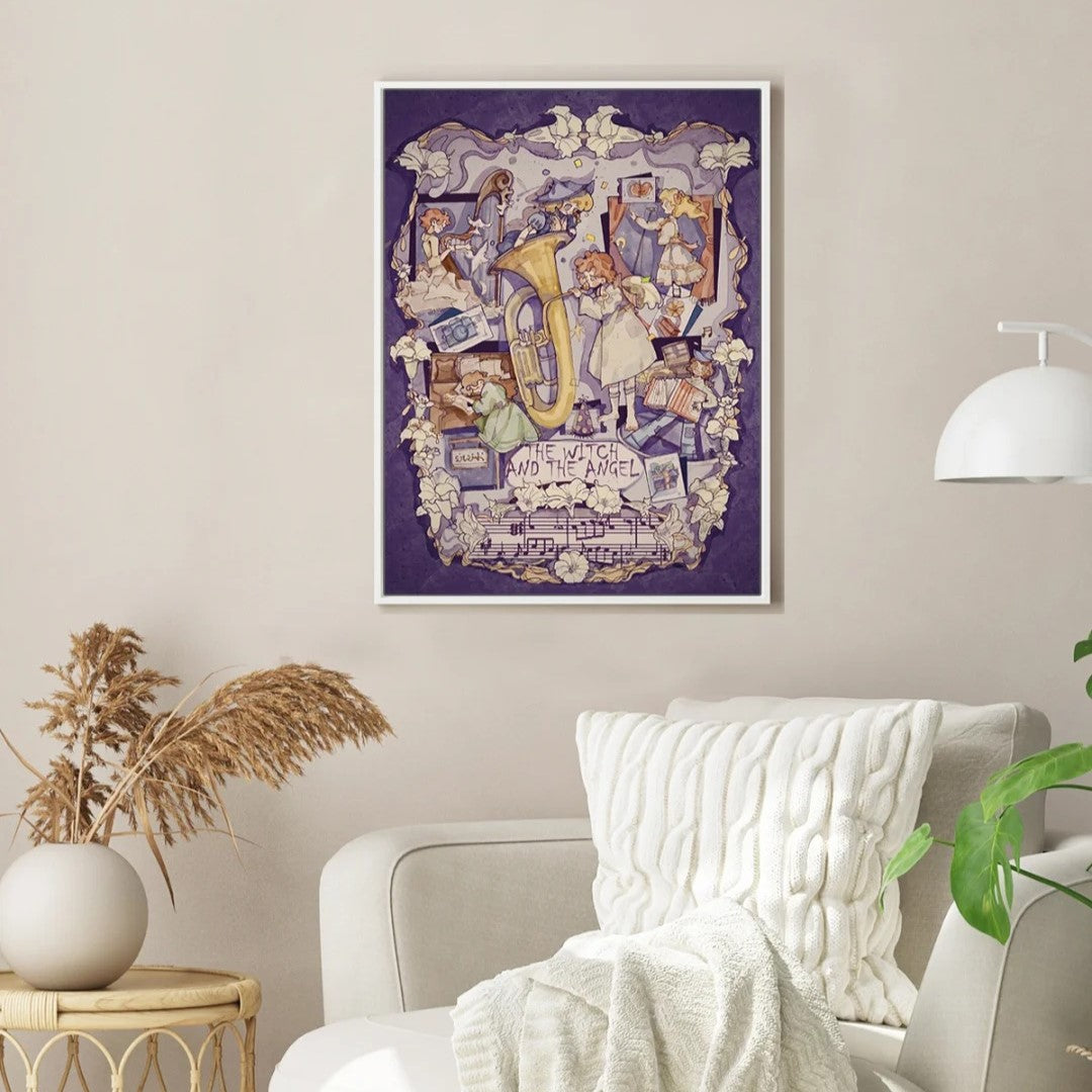 An enchanting collage of whimsical moments unfolds in this artwork. Surrounded by delicate white lilies, the characters bring music and dreams to life—playing instruments, capturing memories, and performing on stage. With soft, vintage tones and magical details, it’s a melody woven with imagination and wonder.