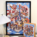 Step into a topsy-turvy wonderland where floating teacups, towering cakes, and playing cards swirl through a candy-colored sky. Every corner of this scene is packed with whimsical charm — from curious characters enjoying a fantastical tea party to playful details tucked into dreamy cloudscapes and pastel rooms. It’s a delightful world that feels both surreal and sweet, like a storybook come to life.